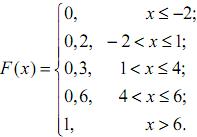 Якщо 4‹x≤6, то F(x)=P{X‹x}=0,2+0,1+0,3=0,6, бо подія {X‹x} є сумою трьох несумісних подій: {X=-2}, яка має ймовірність 0,2, {X=1}, яка має ймовірність 0,1 і {X=4}, яка має ймовірність 0,3.