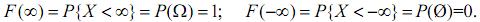F(-∞, y)=0, F(x, -∞)=0, F(-∞, -∞)=0, F(+∞, +∞)=1;