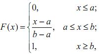 Якщо x≤a, то F(x)=P{X‹x}=P(Ø)=0. Якщо x∈(a,b], то F(x)=P{X‹x}=c(x-a) (імовірність пропорційна довжині проміжка [a,x) ). Тоді