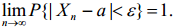 Нехай задана послідовність випадкових величин X1,X2,...,Xn,...Кажуть, що ця послідовність збігається за ймовірністю до числа а, якщо за необмеженого збільшення n імовірність події {| Xn - a |< ε}, (де ε>0 − як завгодно мале фіксоване число) наближається до одиниці, тобто