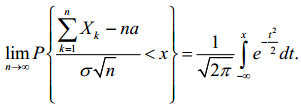 Нехай X1,X2,...,Xn,... − послідовність незалежних випадкових величин зі скінченними математичними сподіваннями E(Xk)=a і дисперсіями D(Xk)= σ2. Тоді для будь-якого дійсного числа х виконується гранична рівність