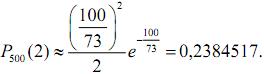 Розв'язання. Маємо: n=500, p=1/365, λ=np=500/365=100/73, k=2;